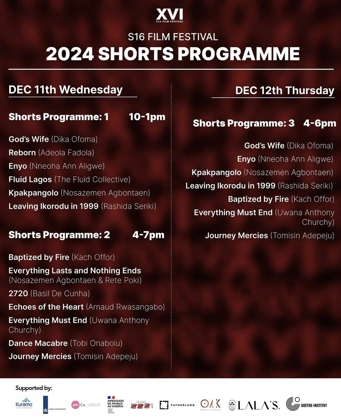 The 2024 S16 Film Festival (Dec 5–8, Lagos) explored the theme “Technologics,” spotlighting how African filmmakers use technology to expand cinematic language. Hosted at Alliance Française, it featured screenings of boundary-pushing short and feature films, an exhibition, panel conversations, and masterclasses with international guests. The festival opened with Rungano Nyoni’s On Becoming a Guinea Fowl and closed with Denise Fernandes’ Hanami, while a strong lineup of indie shorts reaffirmed S16’s reputation as a home for experimental, non-mainstream African cinema. Supported by partners including THE FRENCH EMBASSY, CONSULATE OF THE NETHERLANDS, GOETHE INSTITUTE AND Sterling Bank, the 2024 edition emphasized artistic freedom, new voices, and a growing global engagement with alternative African film cultures.